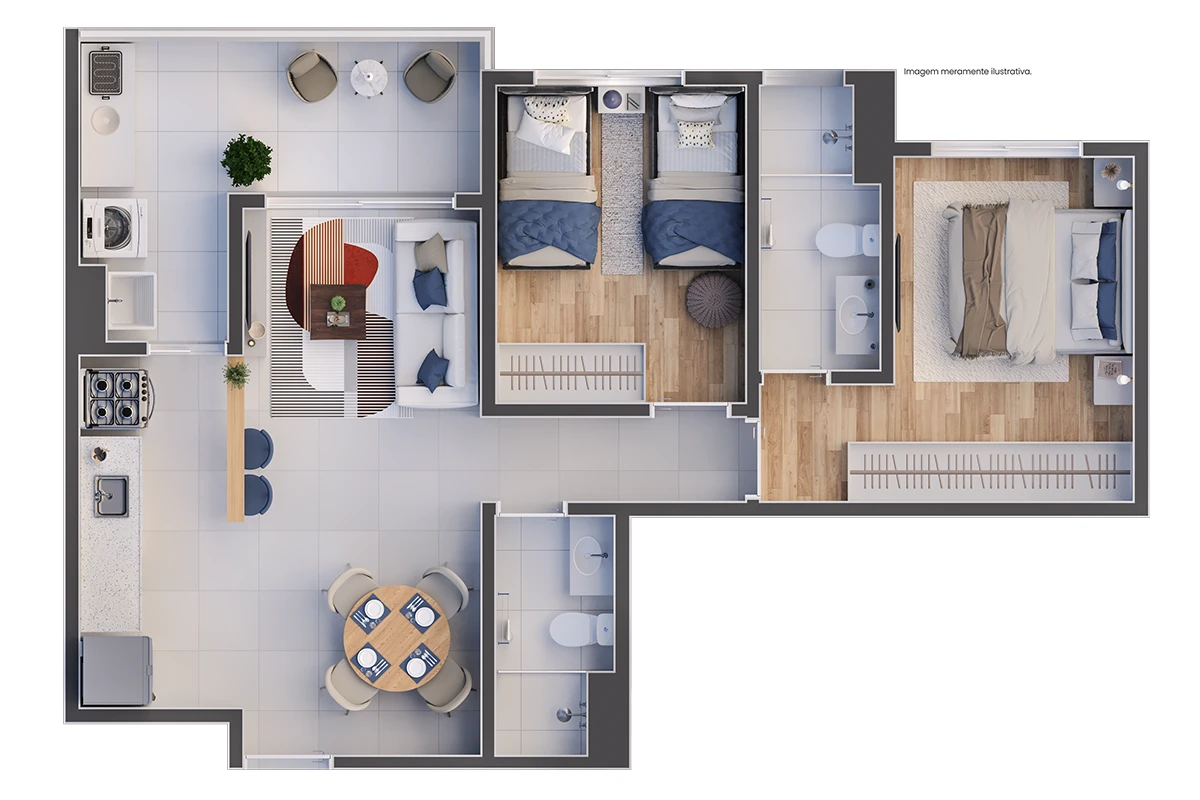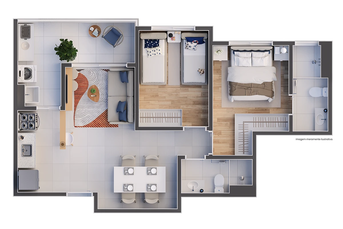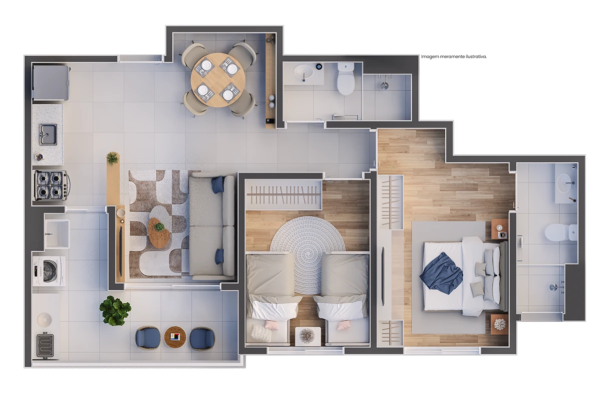 Perspectiva artística da planta com sugestão de decoração. Os móveis e objetos são de dimensões comerciais e não fazem parte do memorial descritivo.