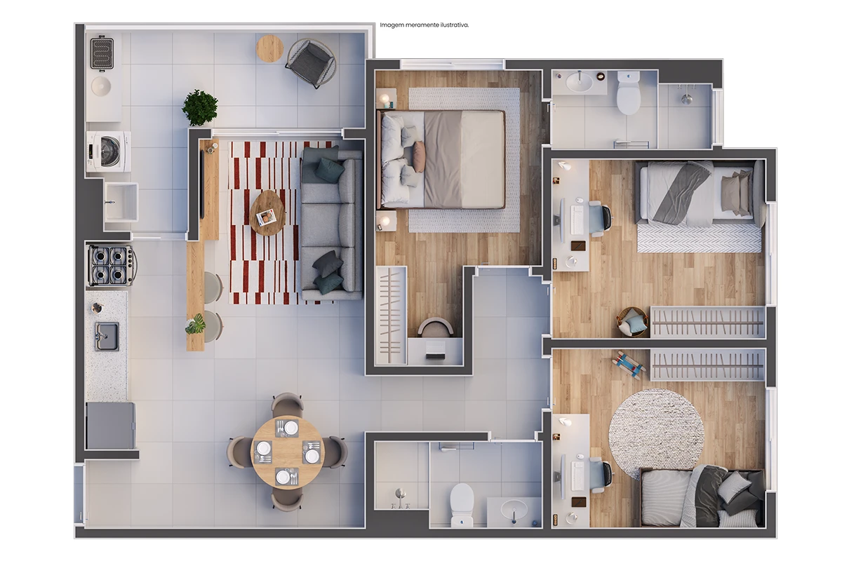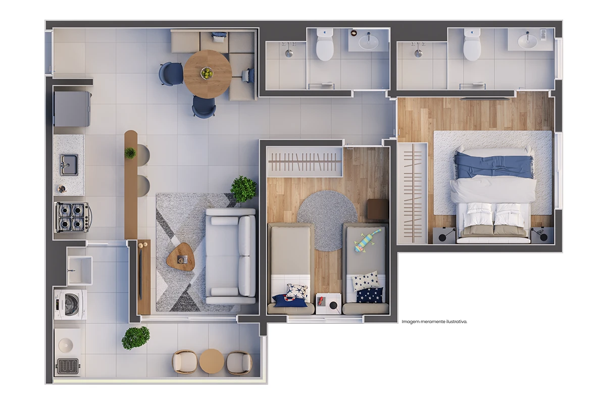Perspectiva artística da planta com sugestão de decoração. Os móveis e objetos são de dimensões comerciais e não fazem parte do memorial descritivo.